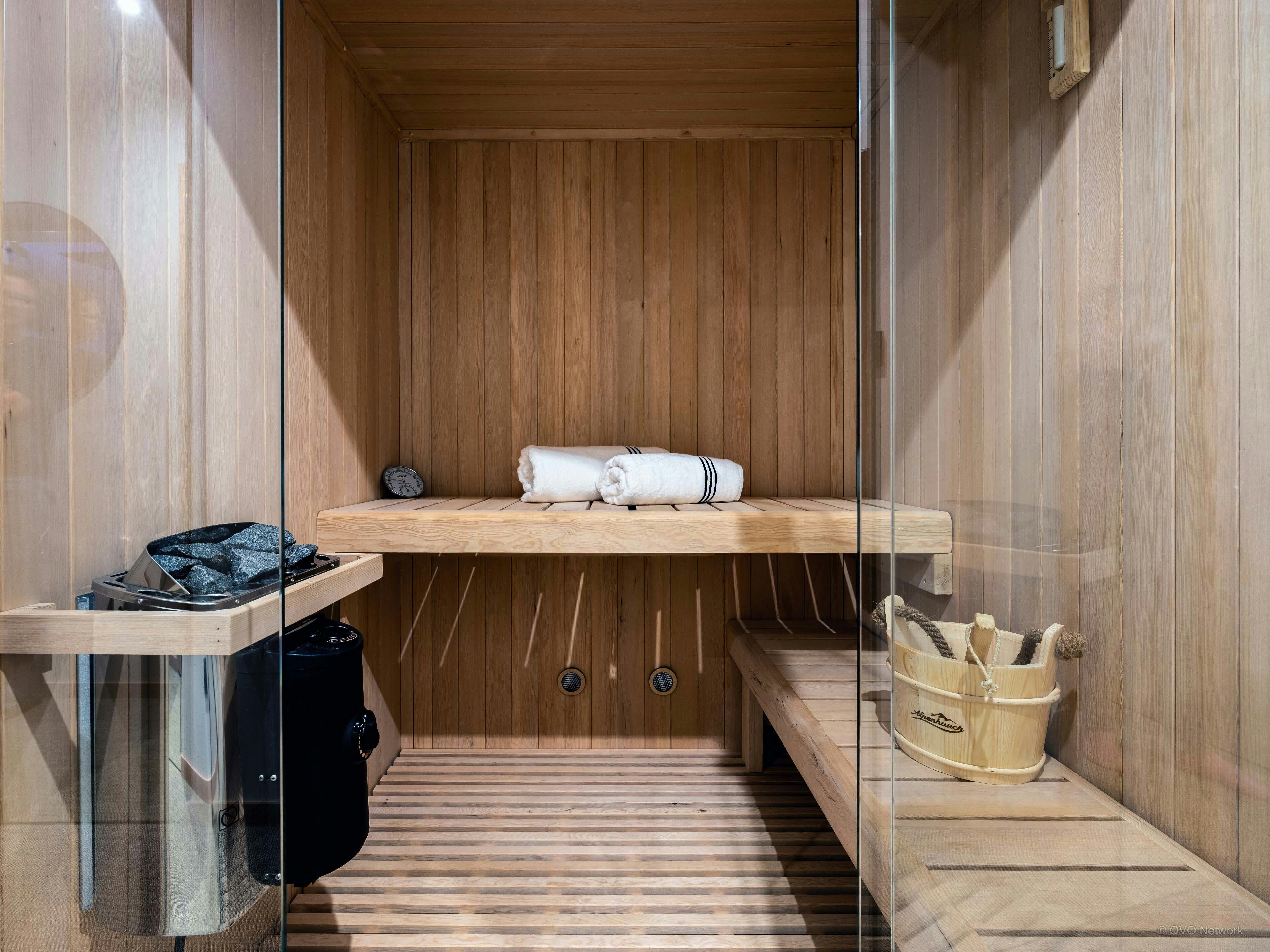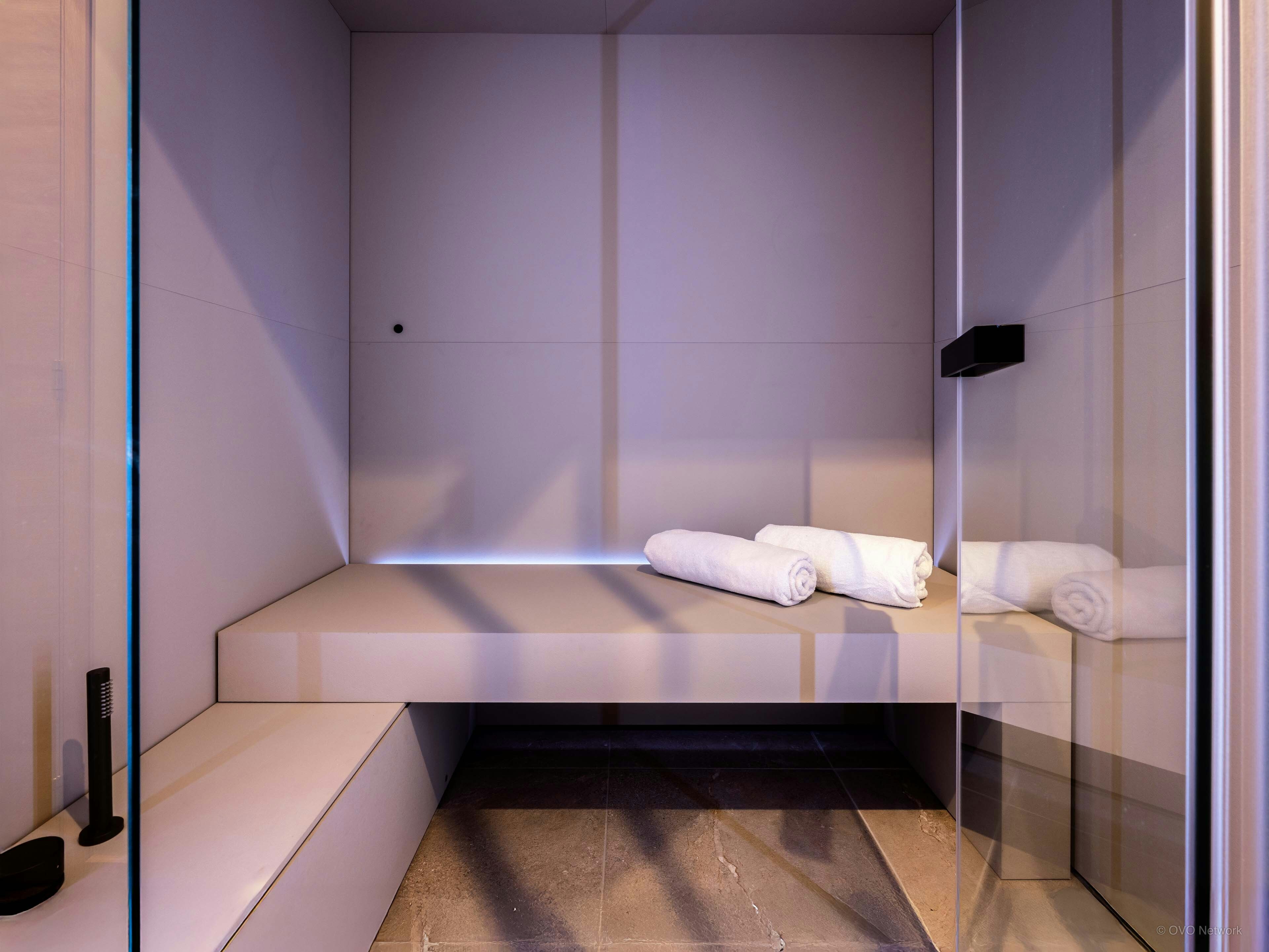 There is no television in the living room, but a comfortable TV room has been set up on the garden level. This level also includes the wellness area, with a sauna and steam room for relaxing at the end of the day, as well as a ski room and a laundry room with washing machine and tumble dryer.