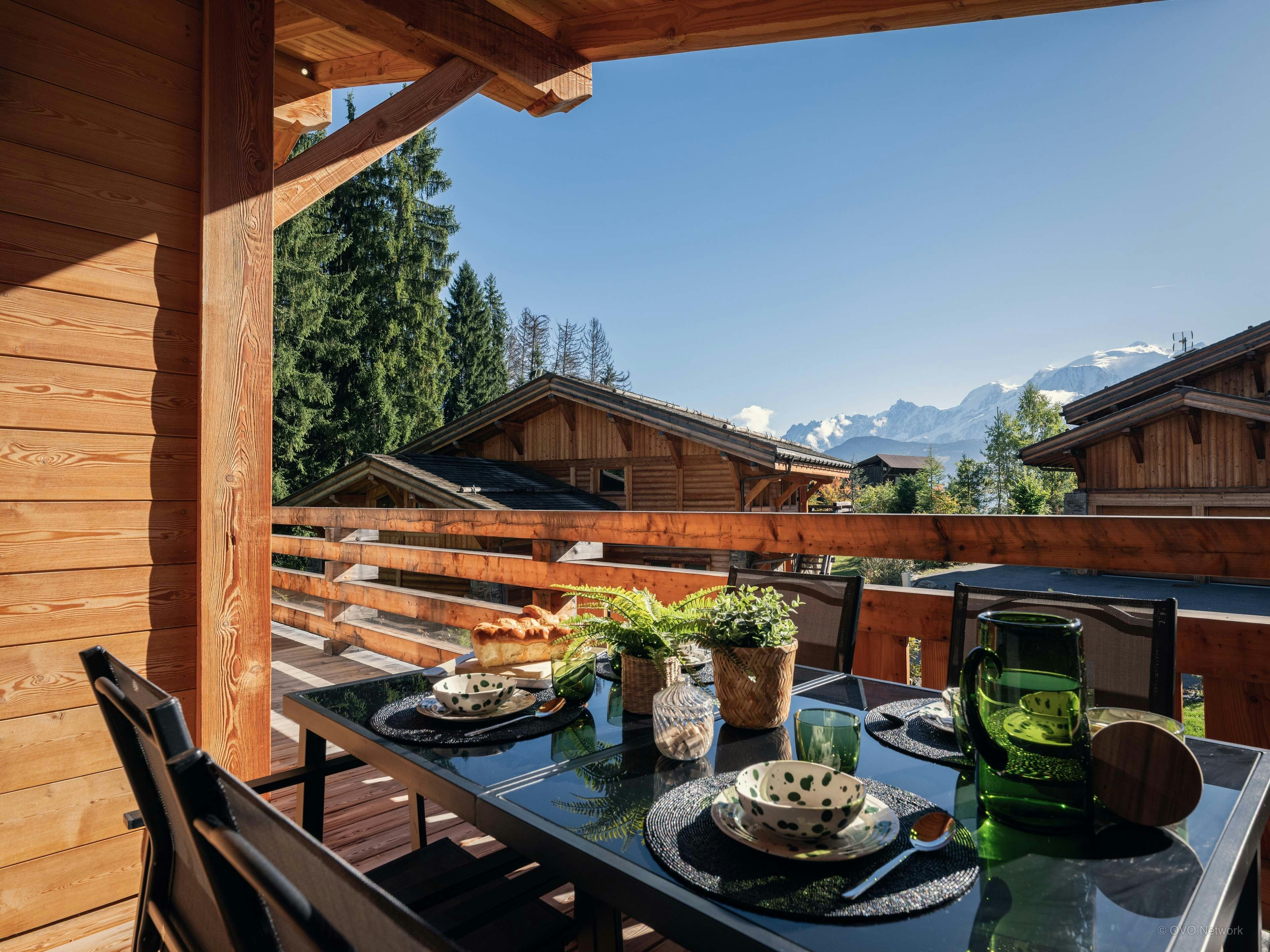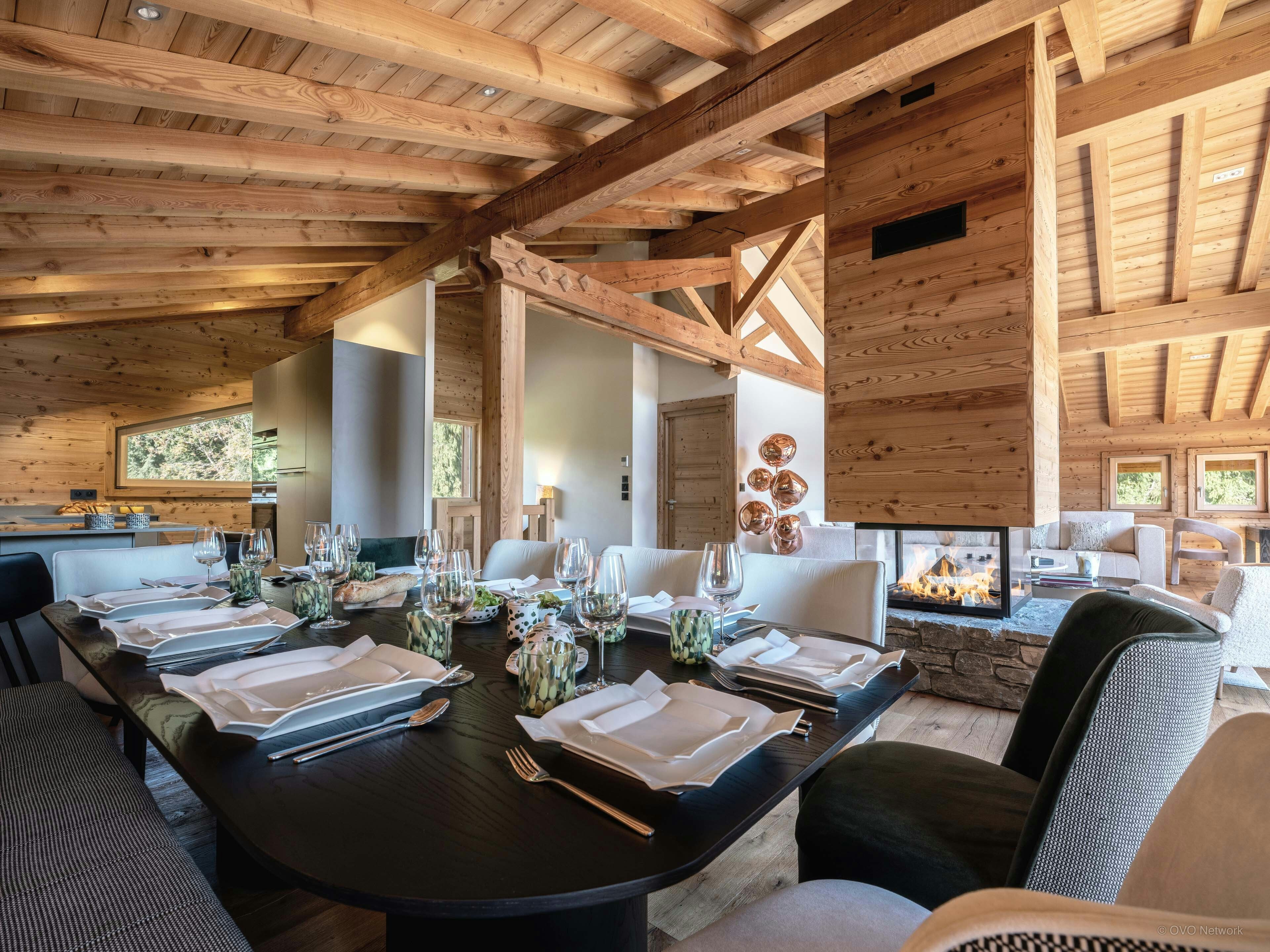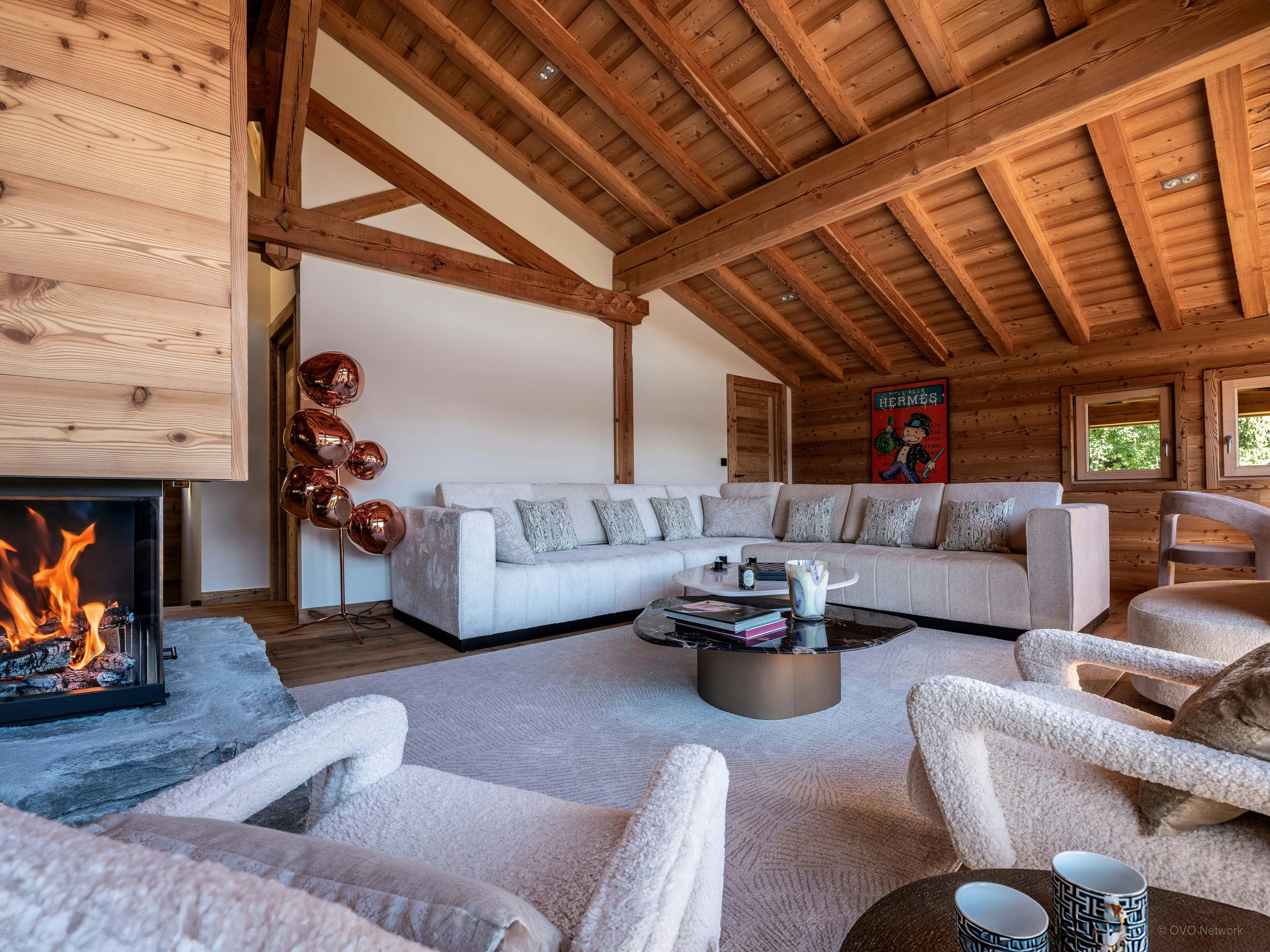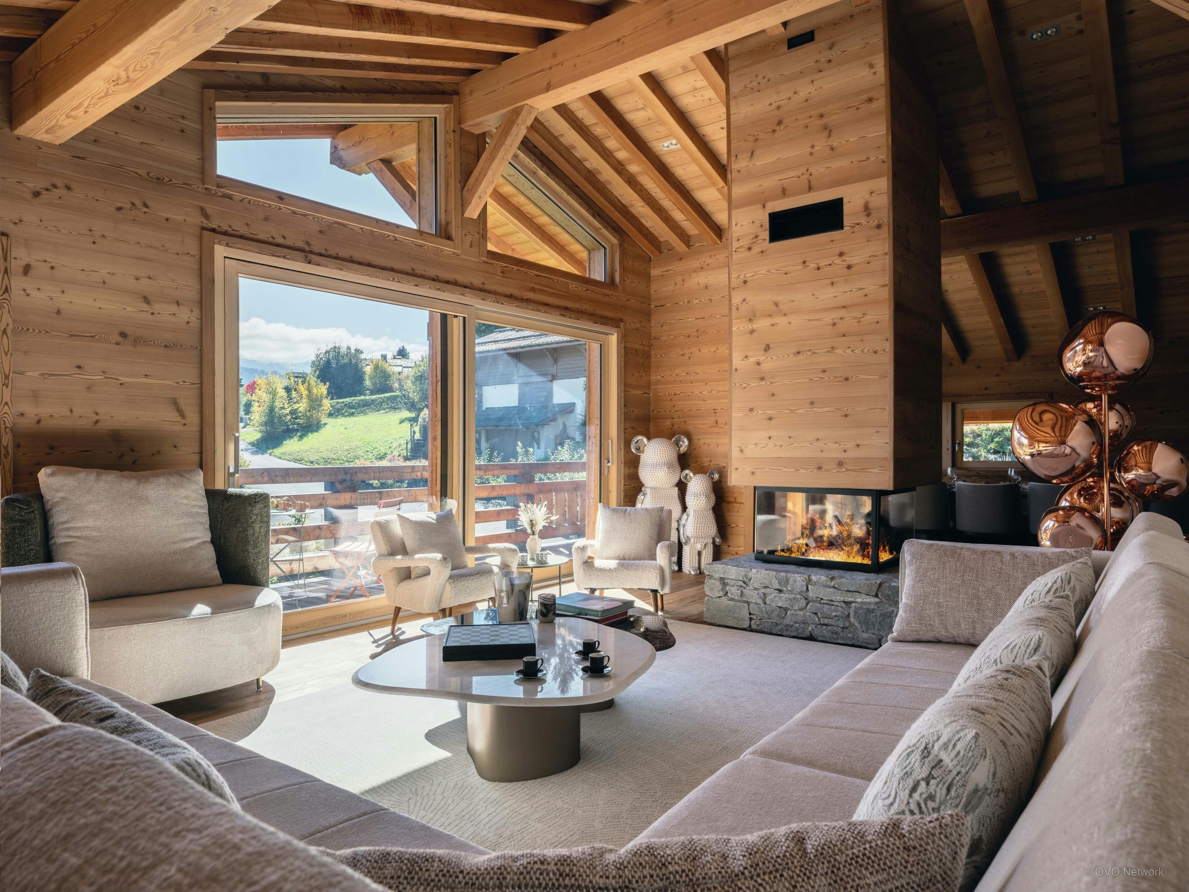 The spacious living area on the top floor is particularly welcoming, with comfortable armchairs and sofas, a central fireplace and plenty of natural light. Large picture windows open onto a balcony with views of the Mont-Blanc mountains.