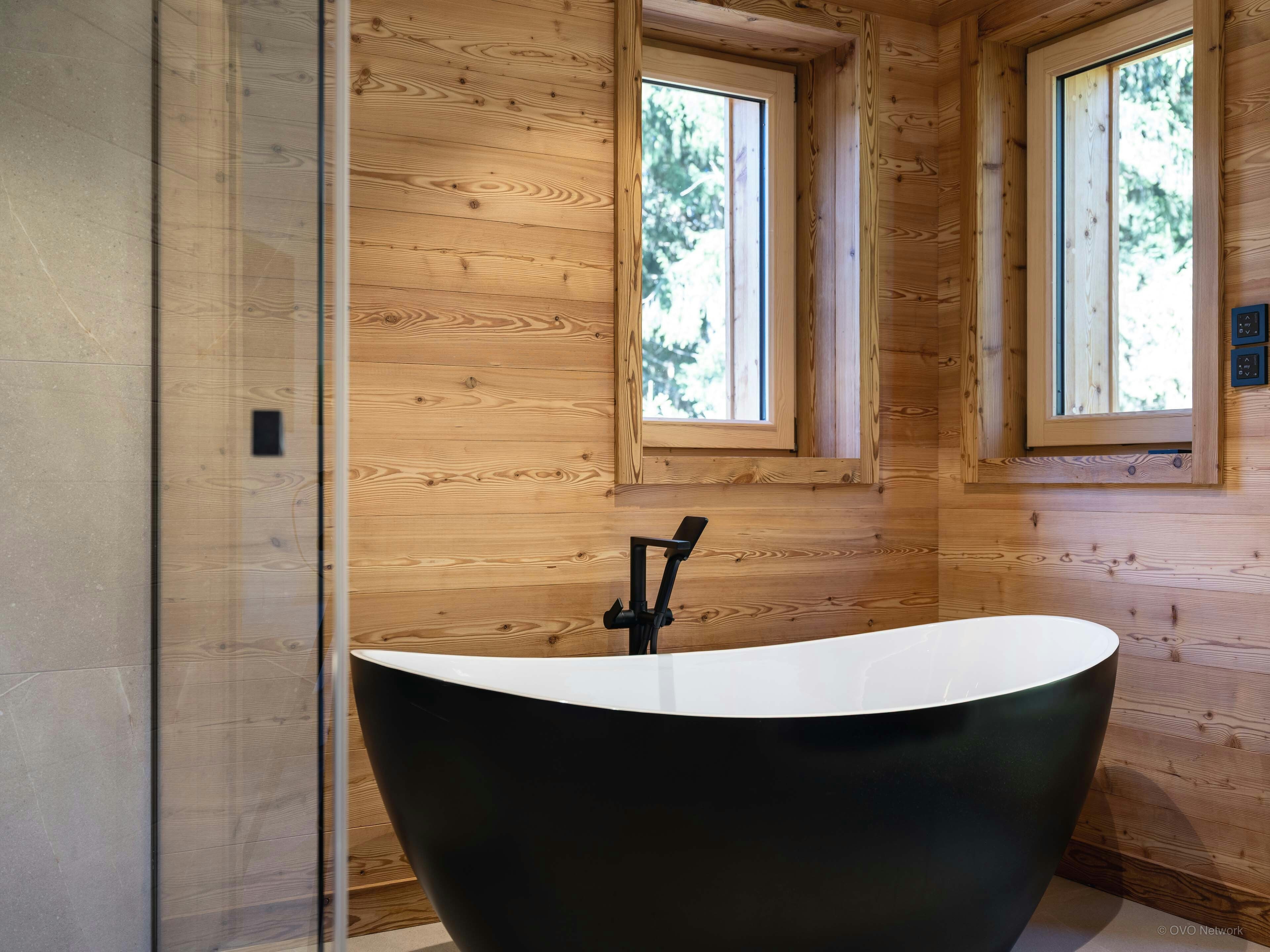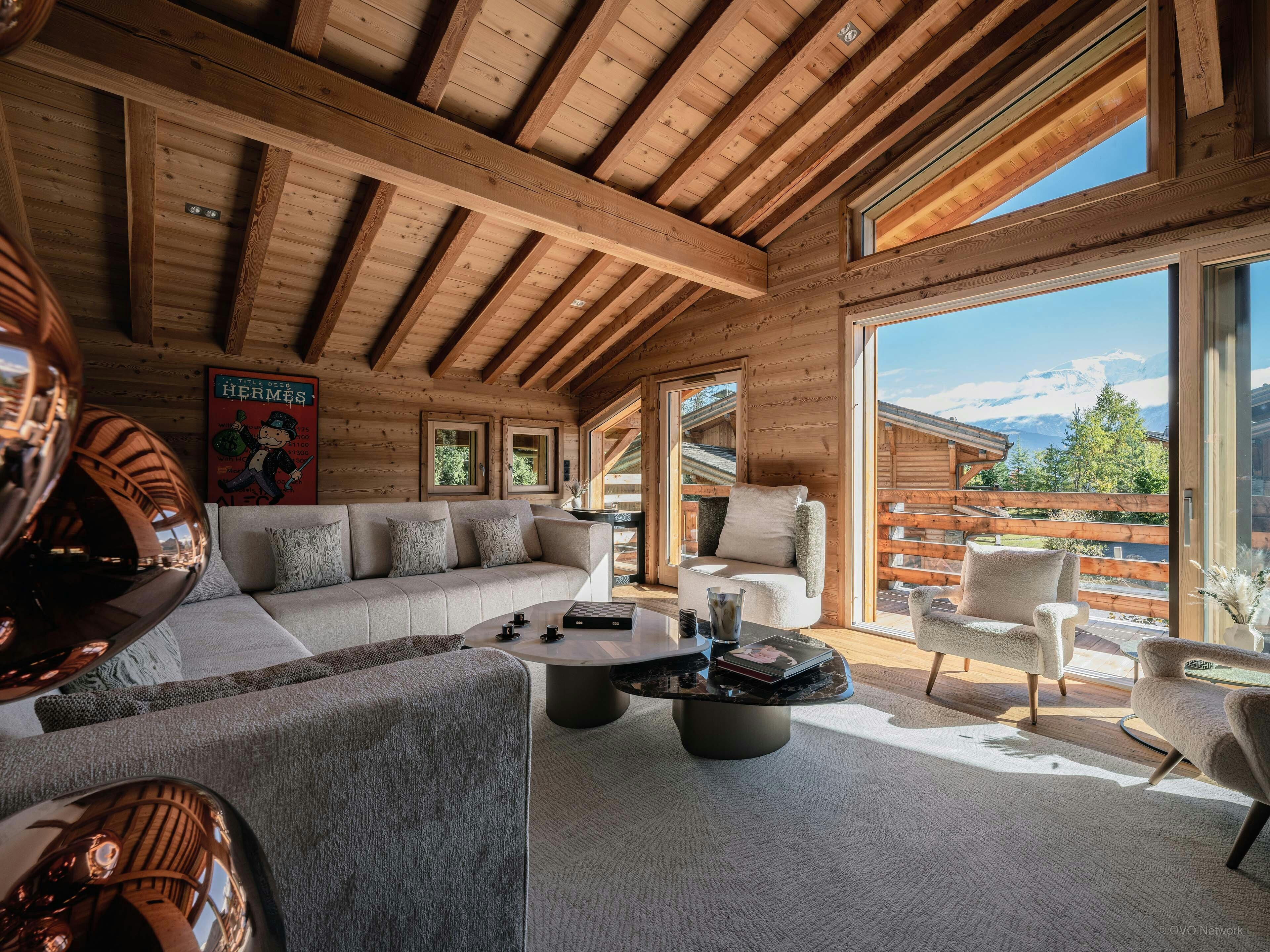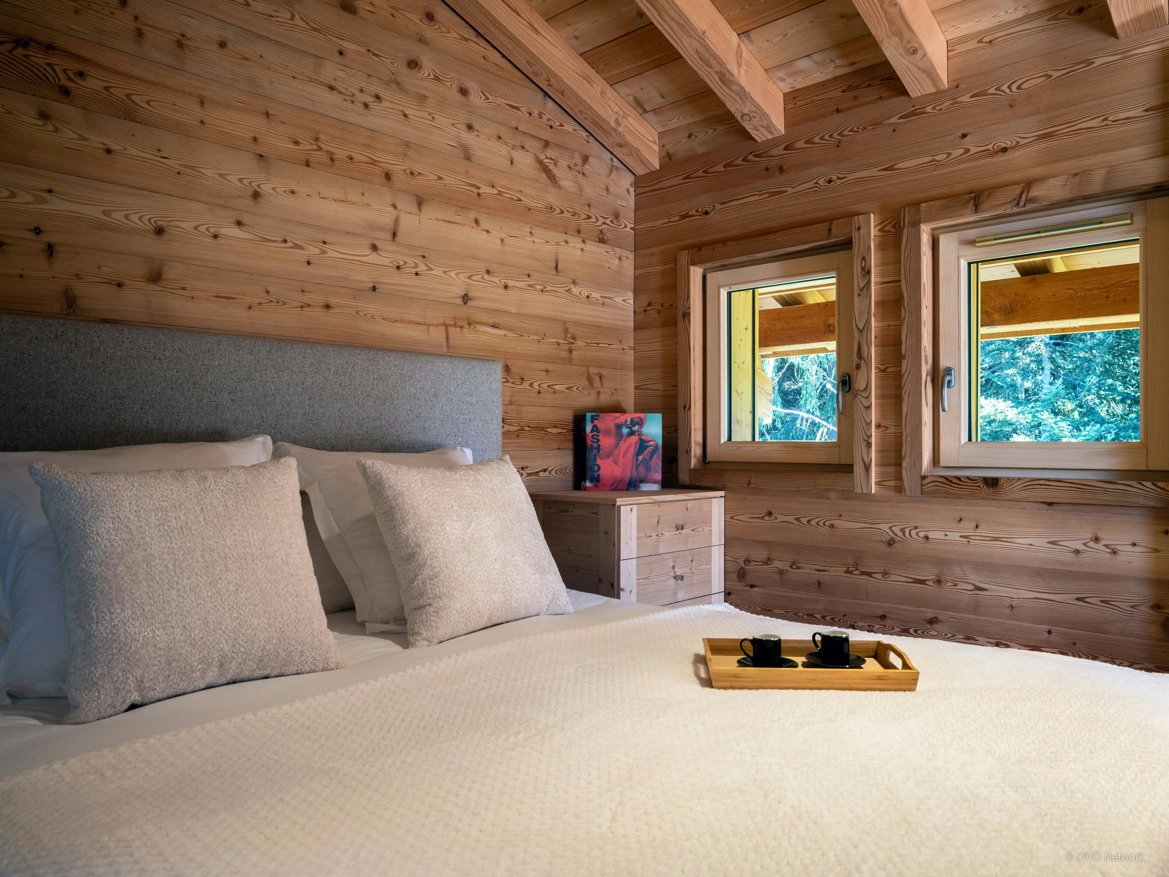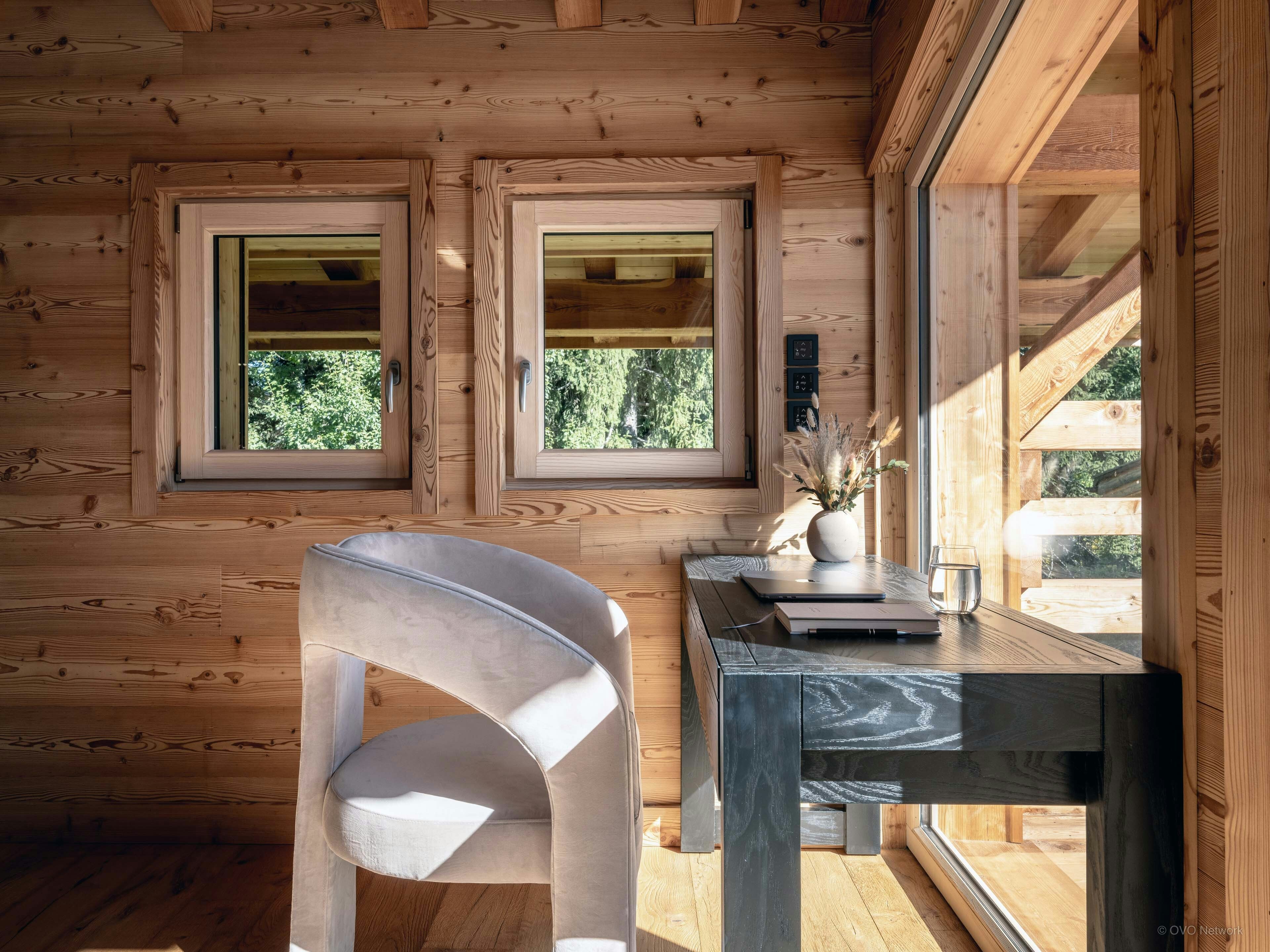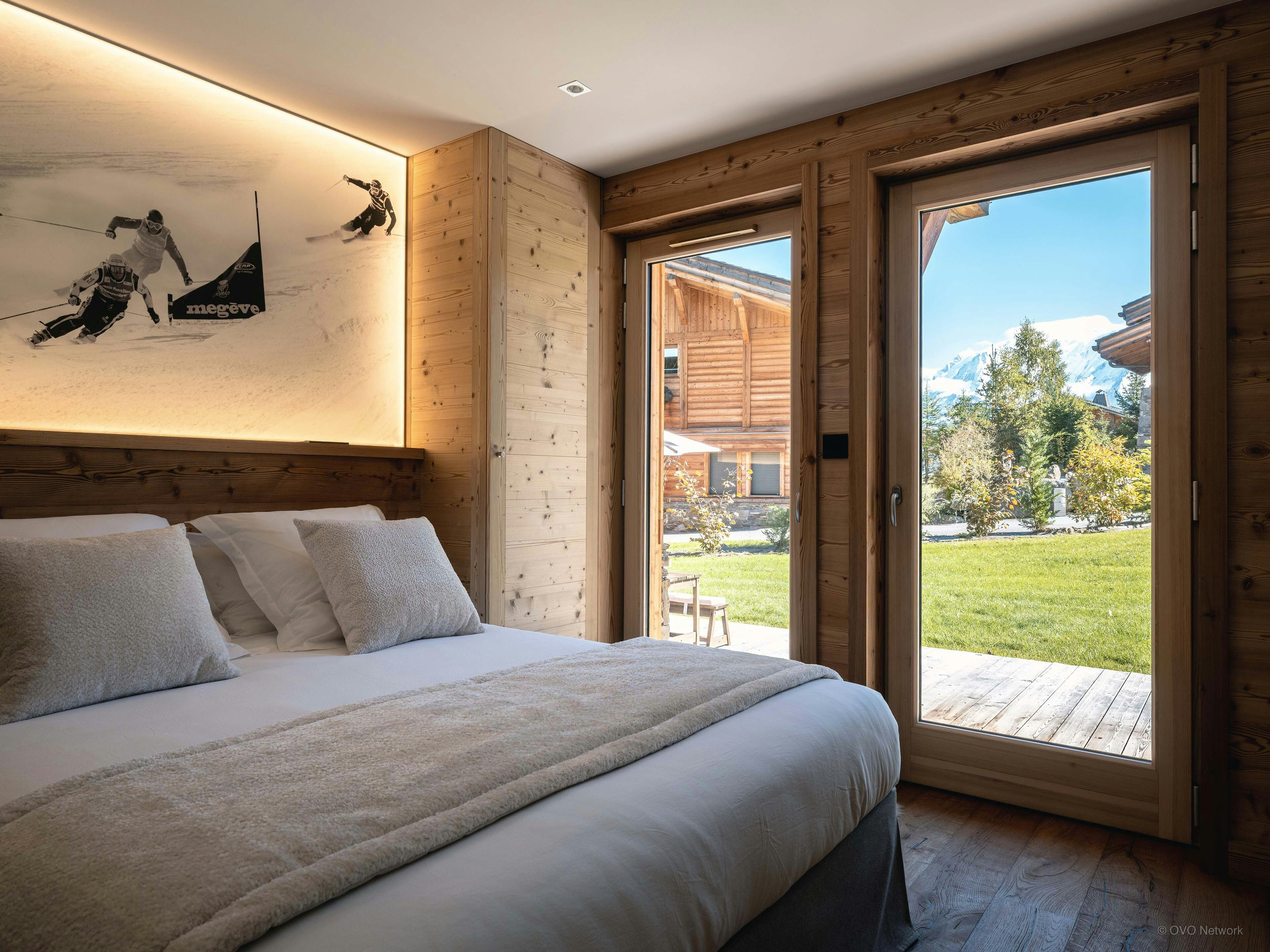The spacious living area on the top floor is particularly welcoming, with comfortable armchairs and sofas, a central fireplace and plenty of natural light. Large picture windows open onto a balcony with views of the Mont-Blanc mountains.