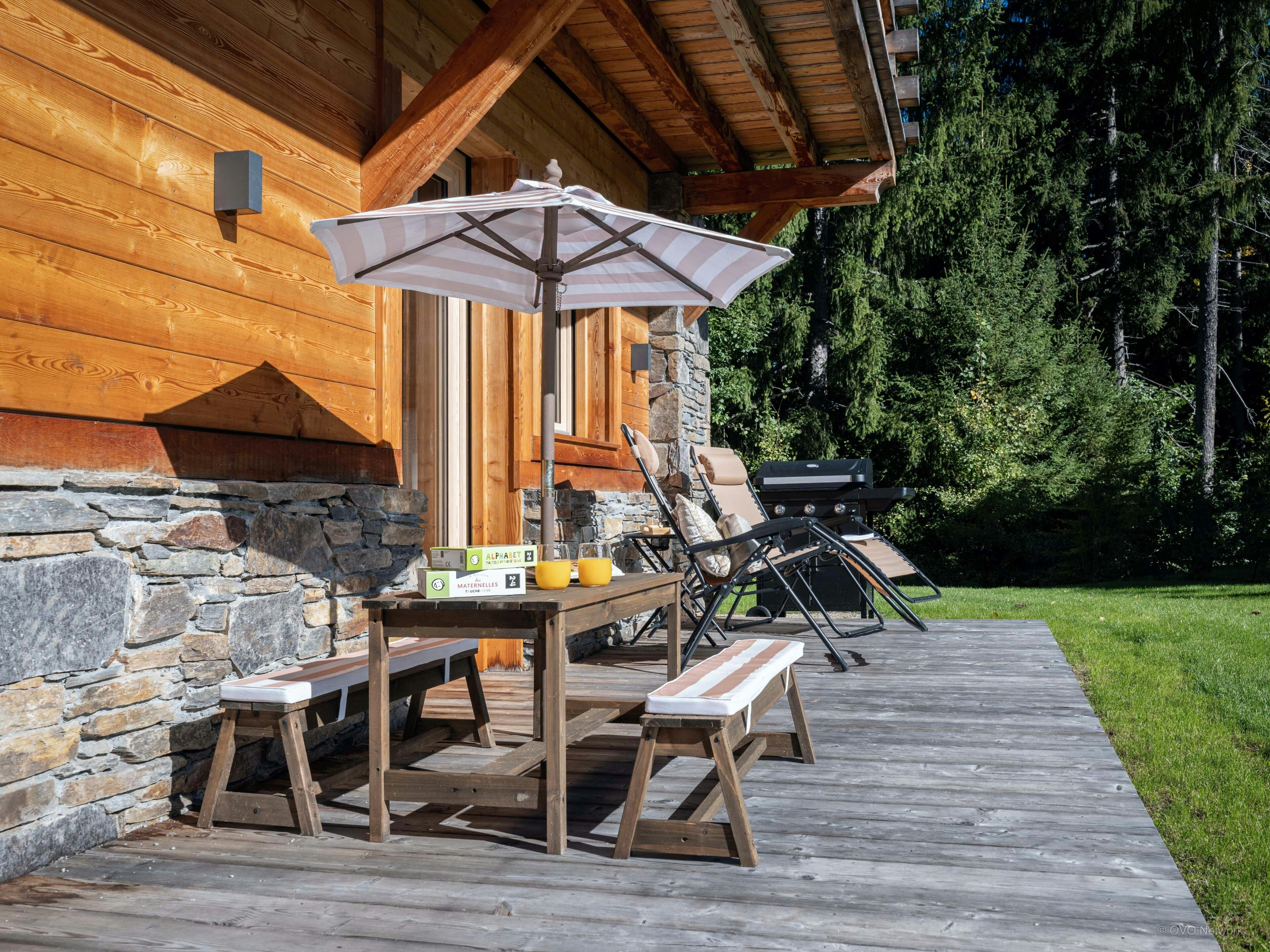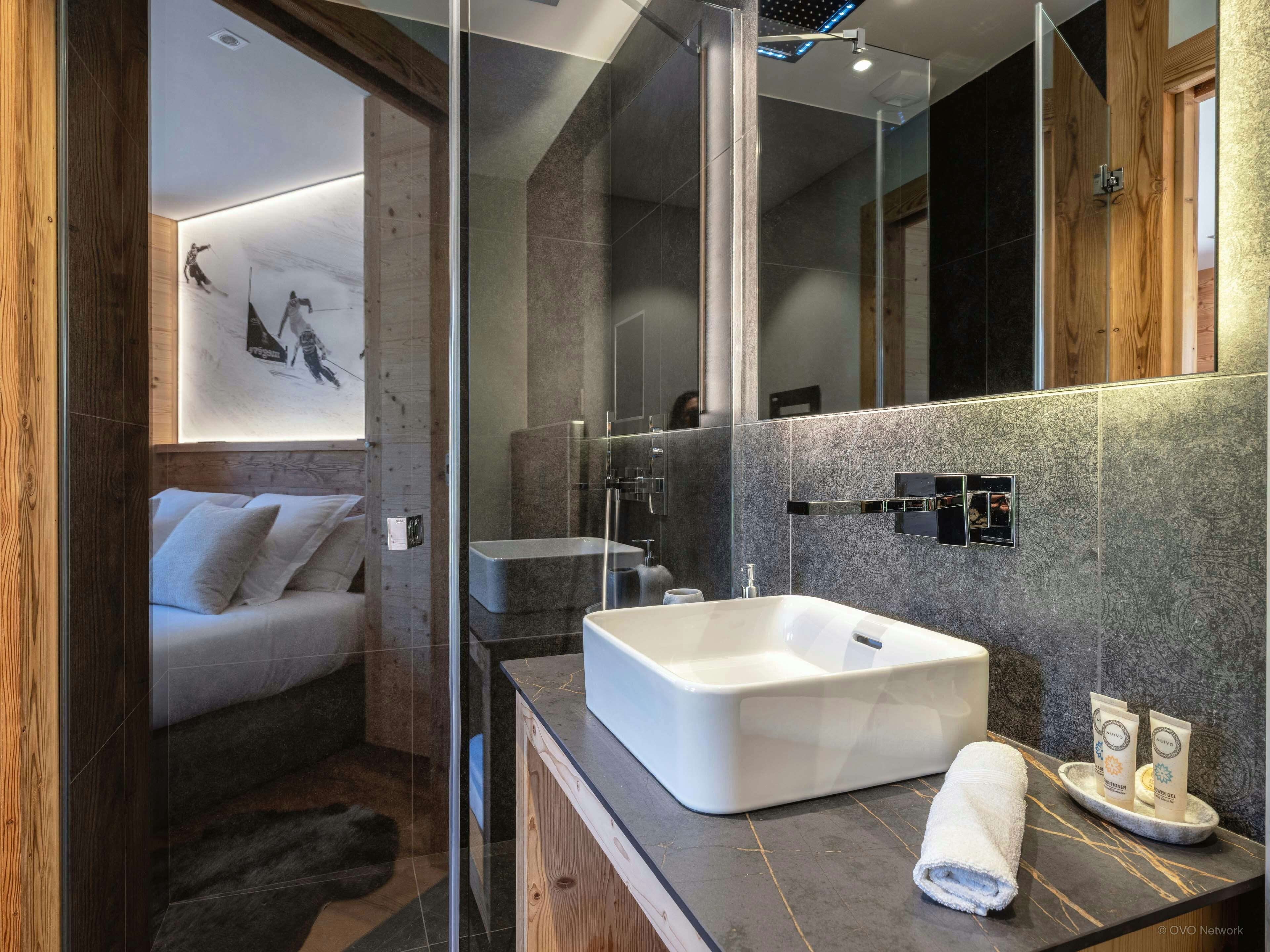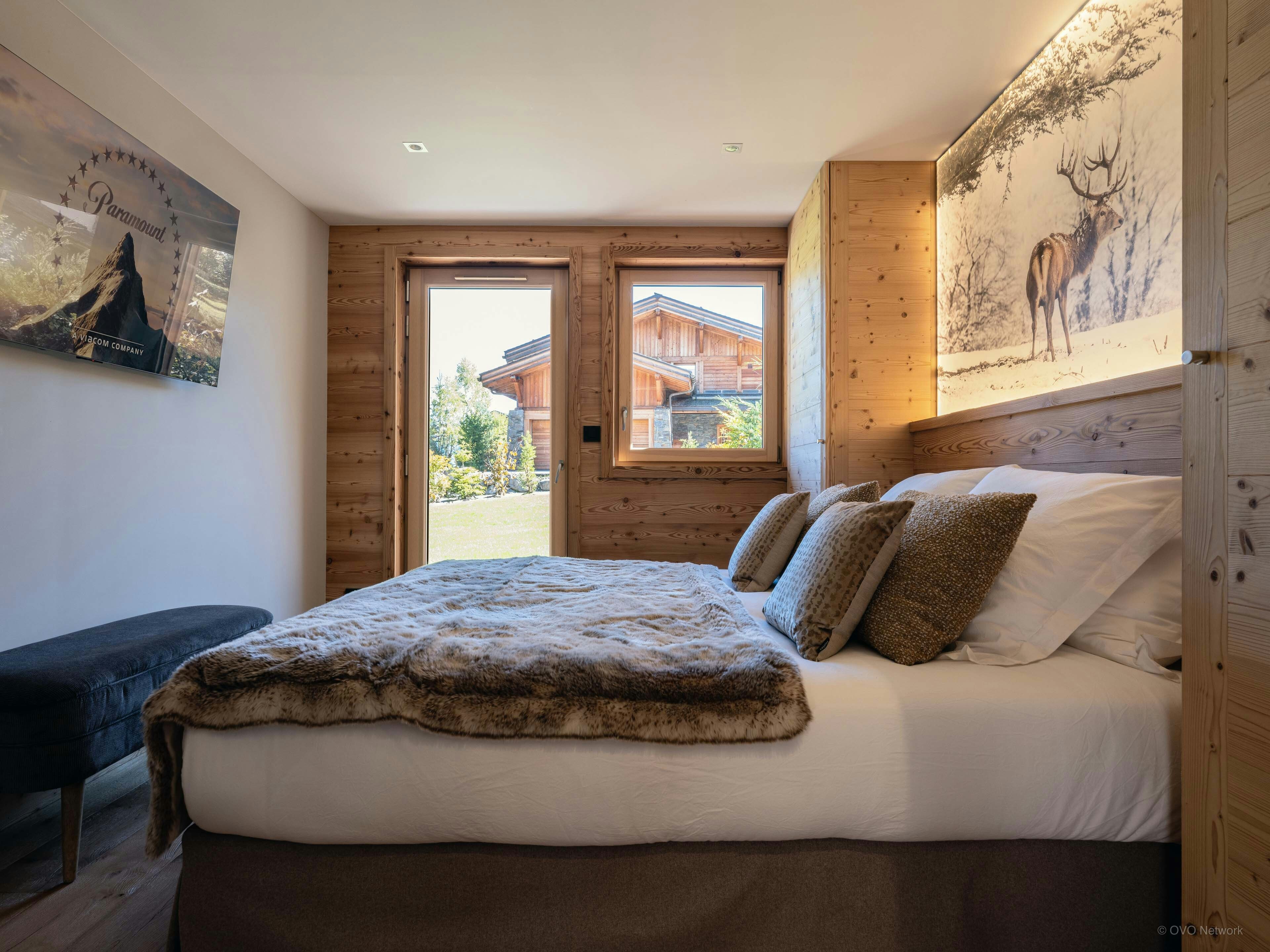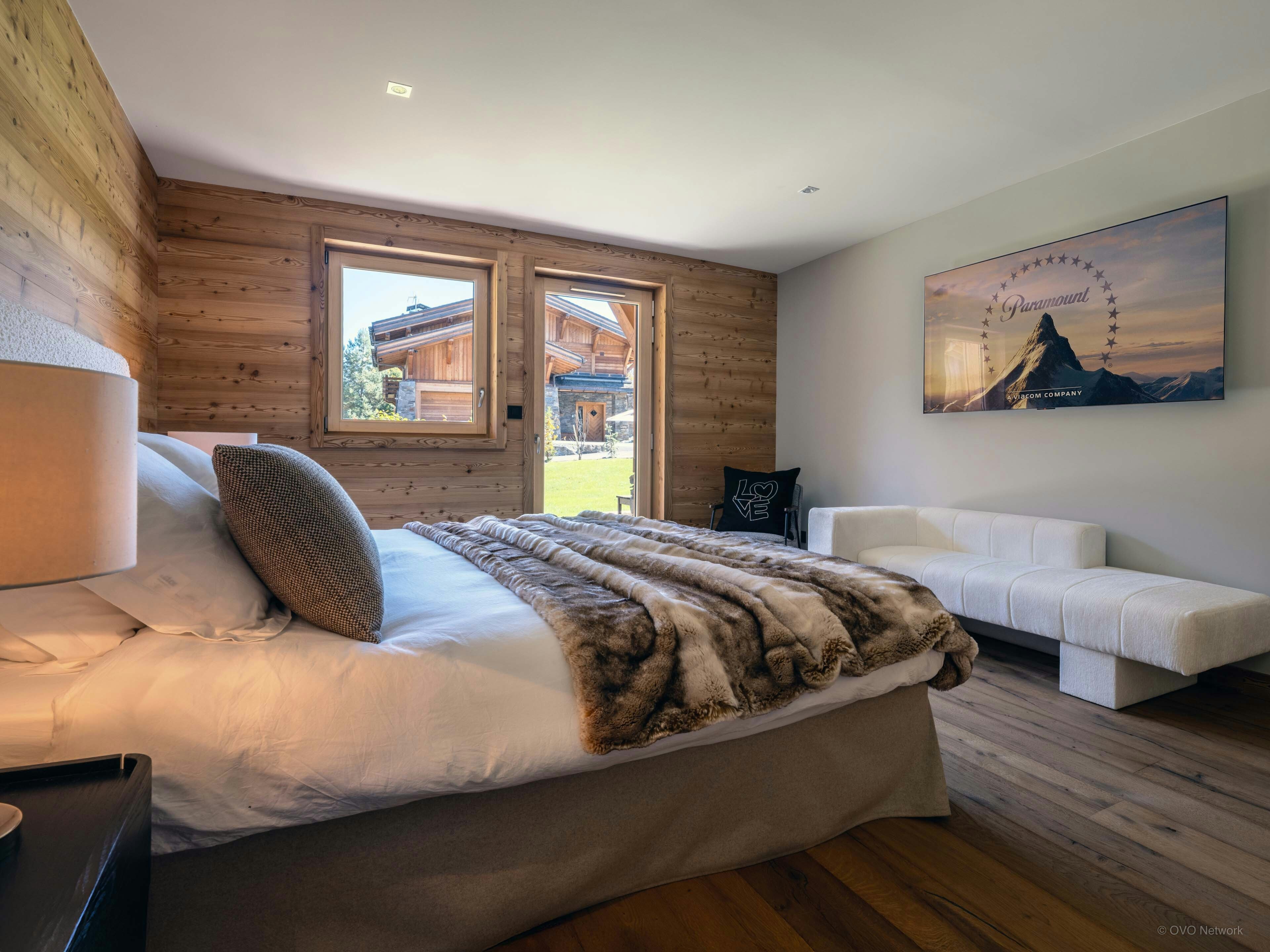 The spacious living area on the top floor is particularly welcoming, with comfortable armchairs and sofas, a central fireplace and plenty of natural light. Large picture windows open onto a balcony with views of the Mont-Blanc mountains.