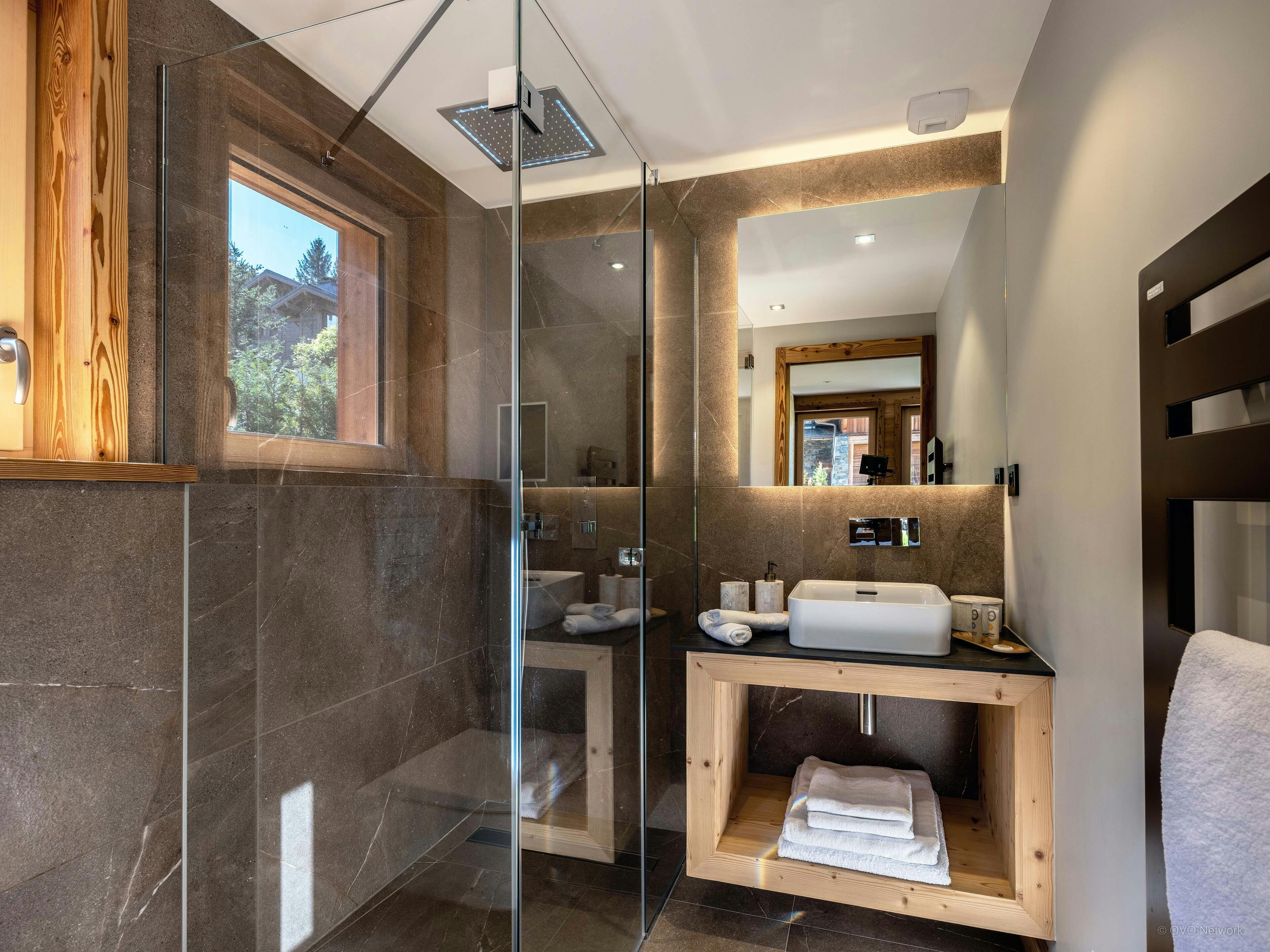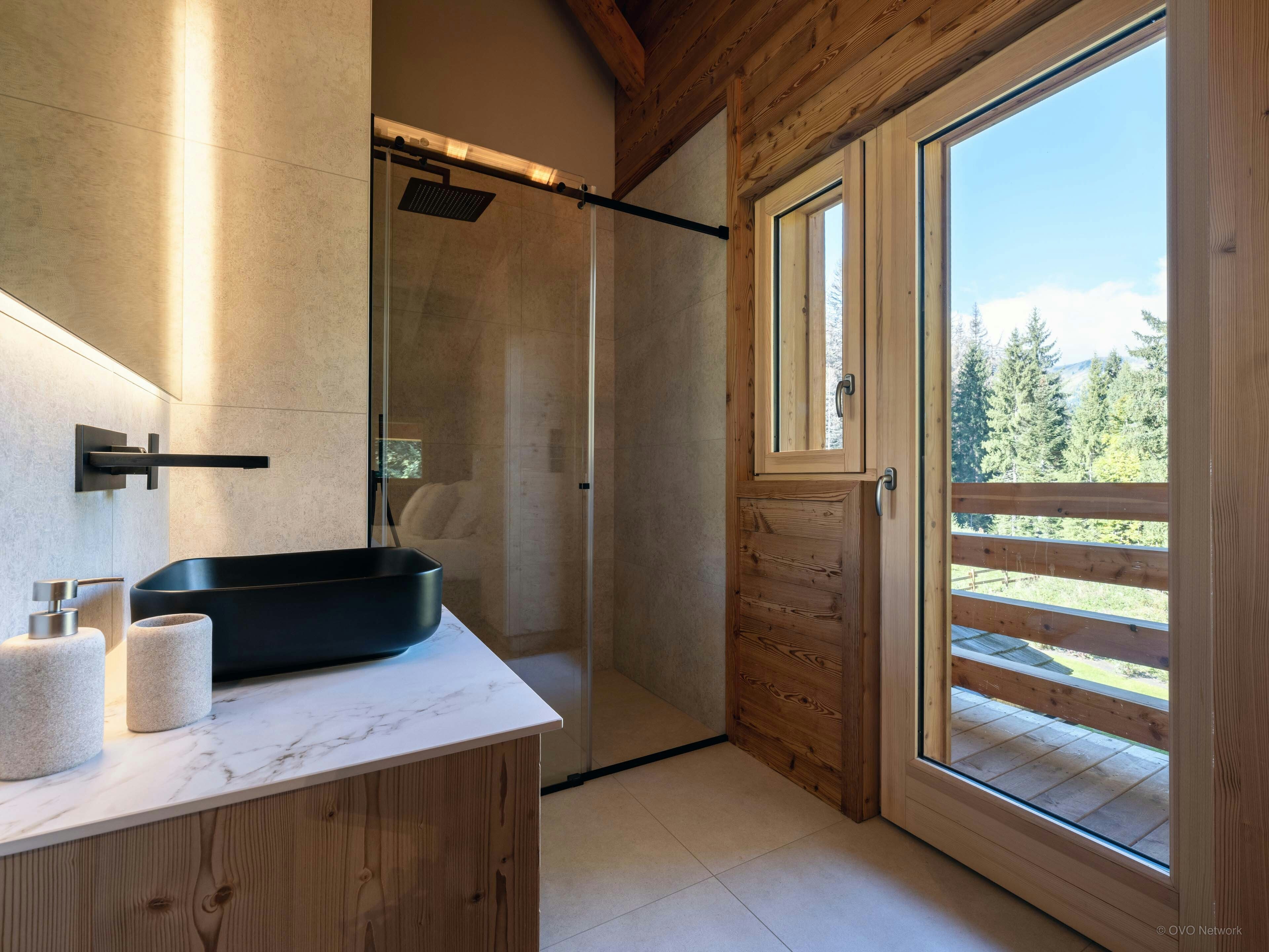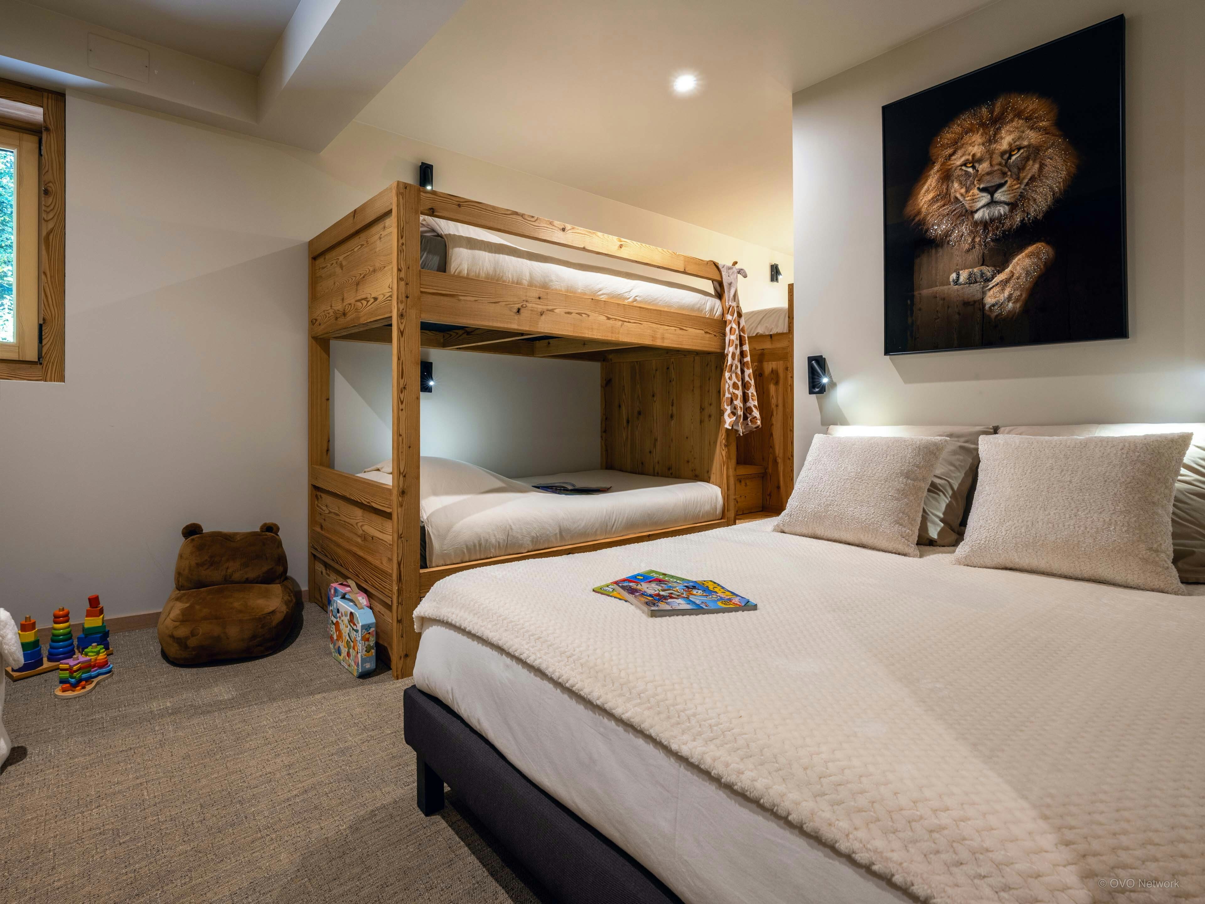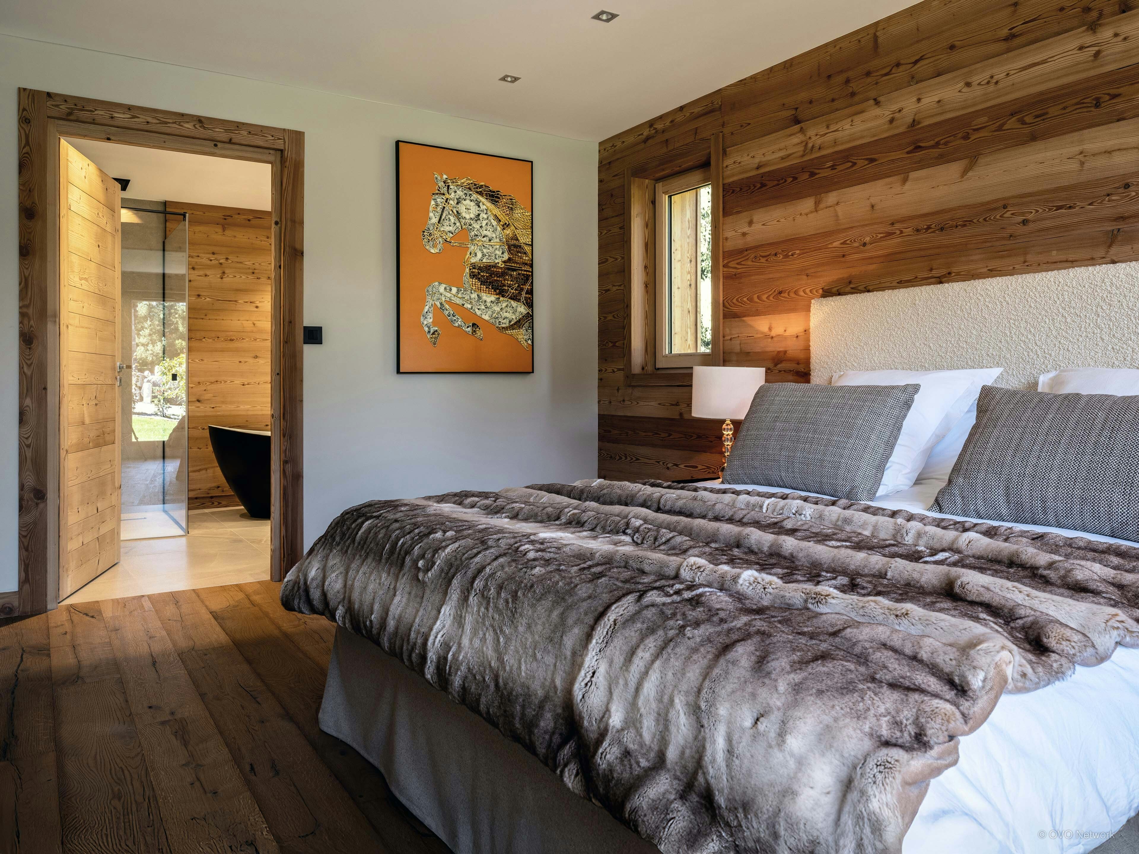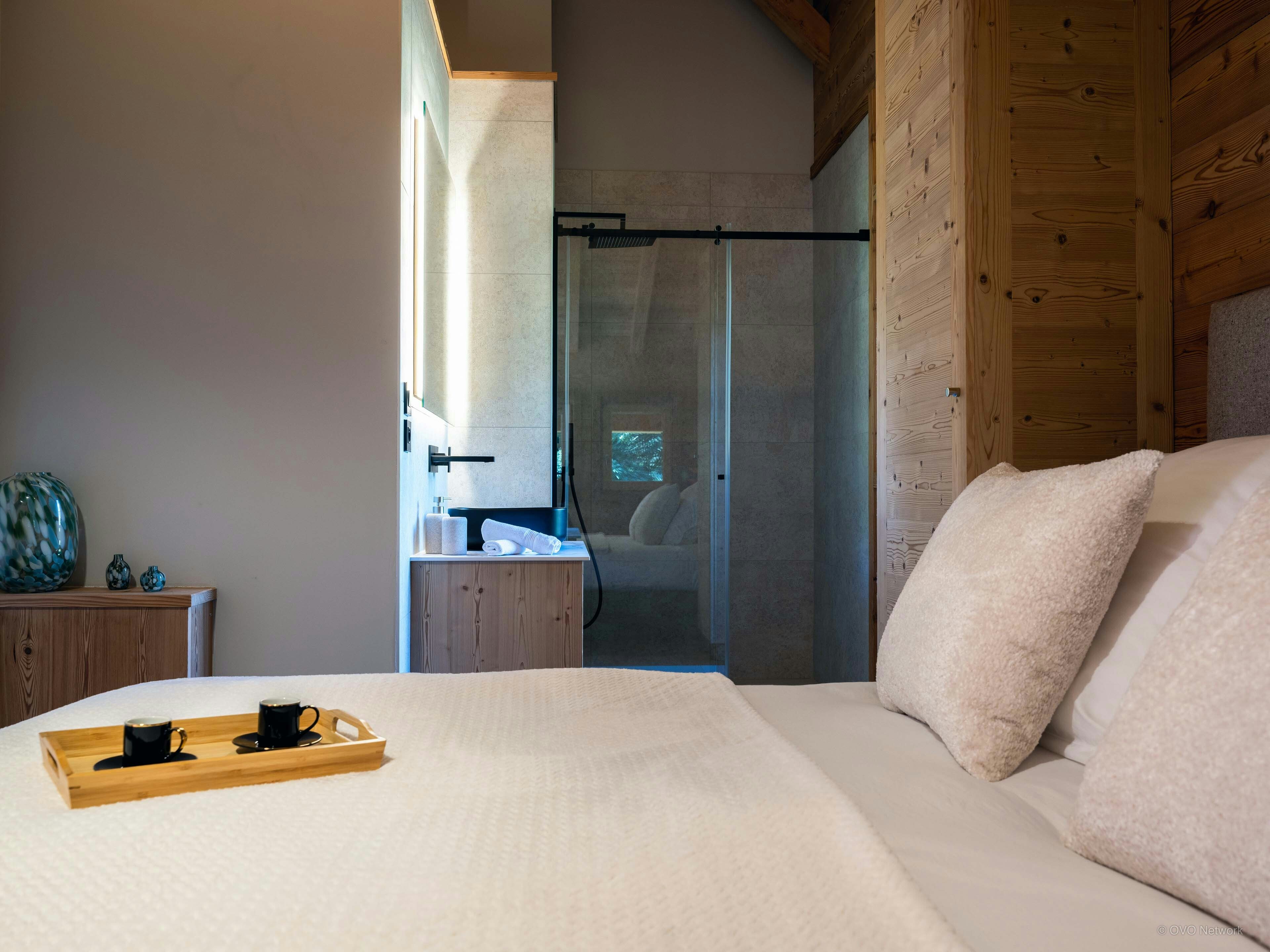 Chalet Ellambra is at the end of a quiet residential street, less than 10 minutes' drive from the centre of Combloux. It has five bedrooms and five bathrooms over three storeys, with a total capacity of 12 guests (including 11 adults).